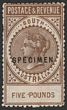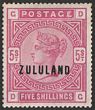 1888-93 'ZULULAND' opt QV 5/- rose. VFM appearance but expertly regummed. Scott 11 cat US$725. SG 11 cat £750. Rare genuine example. (P) |