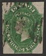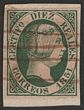 1851 Queen 10R green, imperf. VFU, on piece with horiz m/s cancel, 4 margins. Edifil 11 cat €470. SG 14 cat £650. Exp Scheller. (P) |