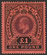 1908-09 KEVII £1 purple & black/red. Superb VFU with Durban cds. Scott 116 cat US$400. SG 171 cat £400. (P) |