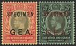 1917-21 'G.E.A.' opt KGV 25c black & red on pale yellow plus 75c black/blue-green on emerald back, opt SPECIMEN, being set of 1921 printing. VF fresh M. Scott N112(s) & N112(a/s). SG 52as & 54as cat £95. (2) (P) |