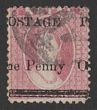| 3478 Click to enlarge photo | 1877-79 'POSTAGE One Penny' opt QV Chalon 6d rose error opt DOUBLE one INVERTED. FU, sl LL cnr crease. Scott 63c cat US$250. SG 93c cat £350. (P) | AVAILABLE at A$100 | ||