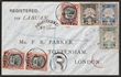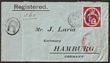1868 QV 5/- lake tied by Kingstown cds to 1896 (Feb 17) Registered cover to Germany, London transit, rev with printed registration label & Hamburg arrival, minor blemishes. SG 53 cat £60+ as loose stamp & 'from x4' on cover. (P) |