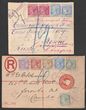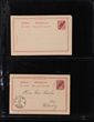 Western Australia - Postal Stationery: 1879-1912 range inc Postcards with 1879 1d brown on salmon (2 U, PSSA cat $80), 1d blue on thick stock (UN, 2 U, $80), 1892 1½d on 3d green (3 UN, $45), 1892 1d brown on white (2 UN, $80), 1903 1d blue thinner stock UN ($100) extra stamp removed & 1902 QV 1½d blue Double Reply (UN, $1000). Lettercards 1912 Surch 1d/2d blue (2 UN, $200). Envelope 1d red un $60. 3 others inc 1899 Land Titles dept Frank stamp envelope. Mostly F-VF. (18) |