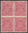 1898-1908 Arms 1d rose, blk of 4, error IMPERFORATE horiz between. VF fresh 3 M/ 1 MUH. Scott 60b cat US$1200. SG 77b cat £1100+. Rare multiple. (P) |