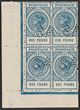 1904-11 QV Thick Postage £1 blue perf 'S.A.' perf 12½ wmk Crown SA LL cnr blk of 4. Superb fresh 1 MLH/3 MUH, 1 sl bends. Scott 143 cat US$1000. ACSC 73 cat $2400+. SG 292a cat £1100 for M, should be at least double for 3 MUH cat £1925 plus premium for scarce perf SA. (P) |