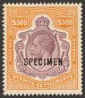 | 3488 Click to enlarge photo | 1902 KEVII £10 green & orange opt SPECIMEN. VF fresh MLH. Scott 99s cat US$450 (normal cat US$14,000). SG 145s cat £475 (normal cat £18,000). (P) | AVAILABLE at A$300 | ||