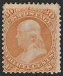 | 8607 Click to enlarge photo | 1861-62 Franklin 30c orange perf 12½. Fresh FM appearance but regummed. Scott 71 cat $1000 for UN. SG 67 cat£2500 for M. (P) | AVAILABLE at A$300 | ||