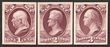 | 3703 Click to enlarge photo | 1909 Lincoln 2c carmine, 1909 Alaska-Yukon Exhibition 2c carmine-lake & 1909 Hudson-Fulton 2c carmine-lake, all horiz imperf prs. Superb fresh MUH, all 4 margins. Scott 368, 371, 373 cat US$205. SG 375, 378, 380 cat £126 for M, should be at least double £252 MUH. (3 prs) (P) | AVAILABLE at A$120 | ||