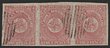 1862-64 Heraldic Flowers 4d rose-lake, horiz strip of 3. VFU, all 4 margins, barred oval pmks. SG 18 cat £330+. Unitrade 18 cat C$300+ plus premium for rare multiple. (P) |