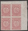 1862-64 Heraldic Flowers 8d rose-lake, UR cnr marginal blk of 4. Stamps Superb fresh MUH, all 4 margins. SG 22 cat £520 for M, should be at least double £1040 MUH. Unitrade 22 cat C$960+ both plus premium for blk. (4) (P) |