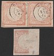 1862-66 Arms Embossed 1P pale vermilion, 2 on piece, error FRAME STRUCK SIDEWAYS, plus 1P with embossed centre in full but only ½ the frame printed (from the joining of the strips). F-VFU appearance, sl flts, almost all 4 margins. Scott 12a & 12(var) cat US$305+. SG 15a & 15(var) cat £337+. (3) (P) |
