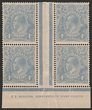 4d Dull ultramarine Harrison Imprint blk of 4, plate 3. Superb fresh MUH with pristine never hinged original gum, usual central gutter folds. SG 65(var). ACSC 113B(3)z cat $17,500 for M, should be at least double $35,000 MUH. Undercatalogued in ACSC as we note that a hinged blk sold for $26,000+ buyers commission in a recent Melbourne auction. Extremely rare imprint blk with only several recorded & possibly unique in fully MUH condition. 2025 Ceremuga AIEP photo cert. (4) (P) |