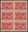 1919 Trans-Atlantic Air Post opt $1 on 15c bright scarlet, blk of 6 (2x3) showing varieties 'no comma after POST' on 1st & 4th & 5th 'no comma after POST & no stop after 1919'. VF fresh 4MLH/2MUH. SG 143/143a/146b cat £1085+. Unitrade C2/a/b cat C$2240+. Scarce multiple. (P) |