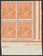 4d Yellow-orange (1919 shade) blk of 4 with part Harrison one line imprint. Plated as 1L53-54, 1L59-60 with margin flaw behind emu. Stamps VF fresh MUH, thin in bottom margin. SG 22(var). ACSC 110I cat $700+++ as singles or would cat $9500 for rare imprint blk. (4) (P) |