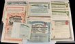 | 10856 Click for more photos | Shares: World Certificates & Bonds. Mostly large-very large, many early C20th inc Russia, Greek, Belgium, India, UK, Mexico Tramways $100+$500, Mining, Industry etc. Noted Bank of Bengal July 1876 certificate for 1 x 500 Rupee share, this very scarce, retail $150. Government of China Lung-Tsing-U-Hai Railway Bond for £20stg, retail $100. Australia North Broken Hill Silver Mining Co 100 shares 1904 retail $75, plus numerous other interesting types. Mostly VG-UNC. Few duplicates mostly diff. (45) | SOLD at A$250 | ||