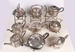 | 10881 Click for more photos | Silver plate. Tea pots of various sizes inc large & extra large. Ornate. (14) c1890s-1960s. Also 3 additional sets of tea pot with pivoting stand & burner. Very ornate. Plus a loose stand (broken in 2 parts) & a burner in a carrier. Some items have dents, repairs or damage. Mostly G-VGC. (19) | AVAILABLE at A$100 | ||