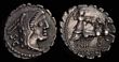 | 12977 Click to enlarge photo | L. Procilius f. ca. BC 80. Silver serratus denarius (3.88g). Rome, special issue.Head of Juno Sospita right, wearing goat skin headdress, S.C behind / L PROCILI F, Juno Sospita driving biga galloping right, brandishing spear in right hand, shield with thunderbolt motif and reins in left; snake below horses.EF/gVF.Crawford 379/2. Sydenham 772. Procilia 2. (P) | SOLD at A$325 | ||