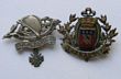 1914-19 Souvenir lapel badges. War related cities: Verdun & Abbeville. First, a French model 1915 steel helmet on laurel spray over scroll 'VERDUN' with hanging brass miniature of the Croix de Guerre. Brooch pin rev. Second, laurel sprays with gilt stars around brass & enamel city arms & scroll in gilt letters 'ABBEVILLE' (missing the last 'E' & catch for pin to rev). gVF, aVF. Nice WWI bring back badges. (2) |