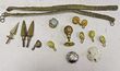 Army. 1900-60s. Lot of (16) items of pith helmet hardware. Inc hook badges (7) (lion & Lancashire rose) in gilt & white metal, chin scales/strap (2), spikes (3), ball mount & air vents (3). Useful for repair/restoration or re-enacting. The white air vent has no threaded post, another smaller vent has no fabric cover. (16) |