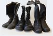 Army Navy RAAF, Police, Fire? boots (3 prs). 1st knee high black butcher boots with rippled finish Approx size 10, dated 1944 by John Frith & Sons ltd. 2nd black knee length leather boots size 7/5, leather soled, these have age. 3rd post 1970s GP black boots approx size 12. GC. 1st & 2nd prs hard to come by. (3 prs). |
