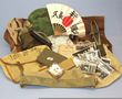 Exciting contents of WWII Pacific Veterans kit bag. Nice lot, brown kit bag; Indian Patt 37 small pack; Patt 37 waist belt with rear buckles removed; JG beret 1944 dated; First aid satchel; Shoe brush; Greg steel wire cutters & pouch; Wrap around puttees (pair); Japanese fan (damaged); tool wrap; Jap cigarette case; short Patt 37 auxiliary straps (2); 3 Japanese coins; Patt 37 water bottle harness; Booklet 'The battle of Wau'; Pamphlet doctrine-dismounted drill; 6 photos of Tivoli concert party & audience; pr of radio head phones. Nice collectable lot. (27) Items total. GC. |