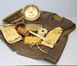 Australia/Great Britain: Small lot of WWII & later personal items inc a leather tripod cover; 1937 militia competition silver plated award trophy; 1945 Pugaree; pattern 37 strap & belt & ammo pouch; leather holster; wall plaque timber; 1942 artillery muzzle cover; GB Royal Engineers Officer's peak cap, some mothing & a leather commando jerkin. Fair to VGC. (11 items) |