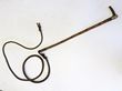Whip. Early, hand-made carved wood, bone & leather stockman's whip, possibly made from a walking stick. Carved antler handle with steel collar set onto lacquered wooden shaft (all measuring 65cm), attached to a 2m braided leather whip. Age unknown but not modern. GC. Most unusual. |