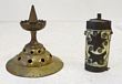 Asia. Tibetan snuff bottle, hand made with yak bone, decorated with brass inlay & engraving, no lid & chain loose. Age unknown but appears to be old. Plus an unidentified item, may be part of an ornament (for a hairpiece?). Made of brass with drilled holes at its base for attachment. Last item included for free. (2) |