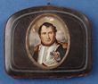 France - Napoleon: ca1815-1816 Gentleman's folding pocket purse. Portrait to centre of Napoleon I in military uniform as he appeared ca1814-1815. Hard, composition material front & back sections with silk & red Morocco leather expanding centre (this much damaged due to folds). Hand painted portrait of Napoleon in miniature direct to glass from within. Epaulettes & decorations picked out in gold & silver. Colours fresh. Minor staining & light scratching to upper portion of portrait. Overall GC. A superb example of popularist miniature art of the first quarter of the 19th Century. |