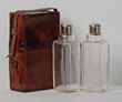Great Britain: ca1899-1902. Boer War Officer's Private Purchase travelling/field decanter set by John Pound & Co, Oxford St, London. 2 x square, cut glass bottles (ea ½ a pint volume) with brass screw-thread additions to neck. Nickled brass screw-cap/nip cups. Both encased in a brown leather cover with strap & buckle fastening. Minor stains & shrinkage to top, strap with damage o/w VGC & comp. Wear consistent with campaign usage. Overall VGC |