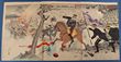 Japan 1894-95 Sino-Japanese War. Ukiyo-e original multi-coloured woodblock print triptych, 'The Great Victory of Our Army at the Battle of Pyongyang', 15 Sep 1894, by Ginko (c1874-97). It depicts the Japanese Army breaking through the Chinese defence at the wall of Pyongyang Castle. At the centre the Battle Commander Lieutenant General Nozu Michitsura on a horse (biography included) waving a sword & organising the attack. Not far away another Commander Major General Tatemi, also on horse back waving a sword, painted in a lighter colour. From the far end it shows Major General Oshima leading his team in a fierce engagement with the Chinese. Not far away it shows the Chinese Army Officer Ma Yukun fleeing while the Chinese Chief Commander Zuo Baigui is besieged (1837-1894, killed in action, being the highest rank killed in the war on the Chinese side, biography included) (approx 35.5x72.3cm). Paper edges signs of wear but printed VF & problem free. Examples in the collections of Museum of Fine Art, Boston, & the collection of the Art Gallery of Greater Victoria, Canada (both info sheets included). |