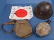 Japan: 1939-45 Selection of WWII combat equipment.. Interesting lot inc Japanese water bottle with cover & cap, small flag (signed) 10"x12" & a small equipment/dilly bag & Civil Defence helmet, comp with liner, padding & civil defence badge, VG - VF |