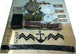 Japan: 1939-45 Imperial Marines Officer Equipment lot - Canvas & leather officer's broad sword waist belt; Officer/Marine pattern aluminium water bottle with gilt aluminium crew lid & laced canvas cover with web sling (damage to cover); a pr of khaki wool puttees with tape ties; a reproduction sword field cover in leather; a black bakelite officer's writing tool case bearing naval anchor to lid (lid cracked); a small printed cotton Marine Company banner 790 x 370mm; a set of 7 x Japanese Invasion Money banknotes (5 cents to $100), Malaya issues; an issue rice bowl & a soup bowl in white enamelled china bearing blue Imperial star insignia; a small decorated (rustic scene) 'Whistling' saki cup (chips). Some wear & minor damage consistent with age & veteran souvenir 'bring backs'. Generally VGC. (10 items) |