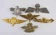 Parachute Qualification Metal Insignia 1980-90 lot of 6, all diff. Netherlands 104 Recon. Co. silver wing, missing rev pin & gold star; Syria, gilt grey metal, clutch-grips removed; Unidentified-Sand-cast brass, wing's flanking chute with vertical 'Commando' dagger fold pin rev; United States Navy on Marine Corps on Clutch-grip rev; South Africa Parachute Regt (3rd Para Bde) Beret badge ca 1982-1992, chromed, clutch-grip; India Parachute Regt, sand-cast W on M; Israeli 1980 Basic Parachutist wing in W on M, on clutch-grip rev with its original card of issue with Tel Aviv Maker address. Together with an Israeli Commando breast badge in W on M, clutch-grip rev. (6) |