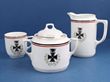 | 20287 Click for more photos | C1914 WWI Iron Cross decorated ceramic milk jug, sugar bowl with lid and cup. Very slight wear to gilding /black on rims o/w VGC with no chips or cracks, 4 Pieces | SOLD at A$140 | ||