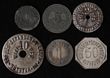 | 20305 Click for more photos | Prisoner of War WWI Camp Tokens Stralsund-Danholm, Pomerania Officer prison camp 1, 5 Pfennig ND (WWI) 16, 19mm zinc. Munster III Westfalen 2, 10 Pfennig ND (WWI) 19.8, 27mm iron Bayreuth, Bavaria 1, 50 Pfennig 17.6, 20.8mm zinc. VF or better. Campbell 4656b, 4658, 4560, 4562, 4323b, 4327 (6). | NO LONGER AVAILABLE | ||
