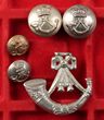 New South Wales 1854-59 1st Regt NSW Volunteer Rifles (Sydney Volunteer Rifles forage cap badge), white metal with 2 lugs (a bit bent) (approx 43mm high). See Grebert pg 7. Victorian Rifle Regiment buttons, small gilt button Stokes & Sons marked. The other 3 silvered buttons are British-made (Firmin & Sons, Firmin London & Crossed Swords Trade Mark). See Cossum's, Buttons pg 10. VGC. (5) |