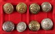Buttons 1880-1910. Various makers. NSW Naval Brigade, 25mm diameter QVC (1). Naval Artillery Volunteers 25mm. QVC made by Charley (1). Queensland, VR Size L (25mm) (2). NSW Mil Forces Size L (25mm). QVC (3). Victoria Mil Forces, Size L KC 25mm. All loops etc are complete. See Cossum Buttons pg 55, 54, 21, 6, 13 (8). |