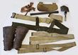 | 20573 Click for more photos | Army 1915 dated Entrenching tool with old handle head rusted into the socket. With AoD marked handle. Some pitting which is typical. 1918 dated cover for above. Pr of 1939 dated Stohwasser leggings. Pattern 08 shoulder strap x 3, 1 is frayed. 1915 pattern water bottle holder. 1908 pattern Webb belts x 2, 1 is light khaki, other is dark khaki. Overall GC. Some hard bits to get. (10 items). | SOLD at A$250 | ||