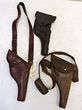 | 20646 Click for more photos | South Africa. Army. C1899-1918. Lot of 3 leather pistol holders, 2 with integral shoulder straps & one with belt loops (Mauser pistol). One of the holsters with shoulder strap has the South African Gov property mark (arrow inside the letter 'U') & has a small rectangular pouch attached. The other holster with sling is unmarked. The holster with the belt loops is for a long barrel pistol looks European made. Front stud is missing. Belt loops damaged (& one is missing). Well used. (3) | SOLD at A$170 | ||