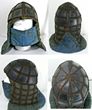 | 20765 Click to enlarge photo | Japan. ca 1850 Kabuto (helmet), late Edo period, for foot soldiers. Padded & quilted coarse blue cotton cloth. The crown overlaid with lacquered iron plates joined by chain mail & chain mail 'squares' to neck flap. crown consists of 30 separate plates shaped & tapered to conform to head shape. Blue cloth lower face shield (probably to pad a face mask) with press-stud fastening (no doubt a later addition). Blue silk cord loops to interior to assist with fastening (securing gap b/w plates at rear top, possibly intended for placement of hair queue. Extension to neck curtain at rear in quilted, padded blue cloth of same type as face shield, no doubt both added at a later (ca 1900) time. Generally VGC. Rare example of a common foot soldier's protective headgear. (P) | SOLD at A$900 | ||