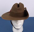 | 20811 Click for more photos | Army. Australian WWII VDC slouch hat complete with rising sun badge, WWI style pugaree, VDC colour patch, chin strap, leather sweat band with minor mould. Hat by Coronet Felt P/L, size 7/8. GC. Original sweatband mostly unstitched. Rare to find a complete VDC slouch hat with all accoutrements. See previous lot VDC uniform. | SOLD at A$625 | ||