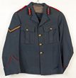 | 20877 Click for more photos | Army Cadet. An usual possibly 1940s blue/grey wool, two pocket patrol jacket. Most likely to a cadet Lance Corporal. School/unit unknown - Queensland? No tailor's label, although it is named to 'G. Stavel', Lance Corp. The jacket has an open lapel collar with gorget patches in dark blue with red/yellow centre colours. The shoulder boards are dark blue with red piping. The barrel cuffs are piped in a red 'V' There are 2 chest pockets. Made to take two belt hooks. Buttons are KC brass map of Australia (one missing). Lance Corp stripe in gold bullion on dark blue. Scattered mothing & wear overall. One bad 3 in tear to front/bottom. One gorget patch frayed. Needs restoration. Seam on right cuff needs re-doing. An unusual tunic not known by us. Has display potential, could be rare. | SOLD at A$275 | ||