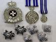 | 21428 Click for more photos | Queensland Police QC hat badge, rank pips & stars (6) plus Tasmanian Police Diligent & Ethical Service Medal & miniature (QC). Medals copies? Enamel QC Queensland Police badge has had lugs removed & pin fitted, the hook to rear is missing. (9) | SOLD at A$80 | ||